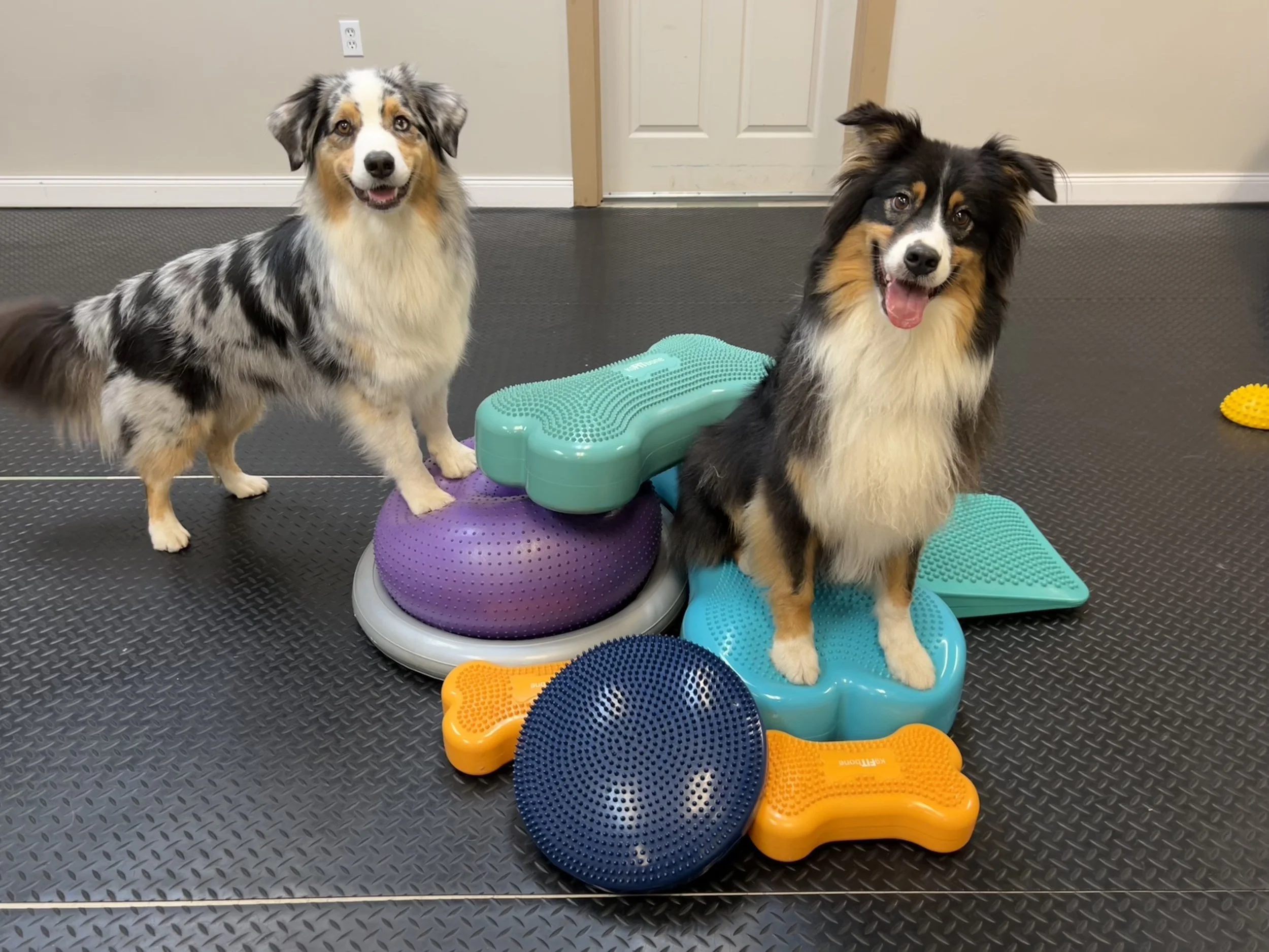 Equipment includes: FitPAWS fitness and conditioning equipment (Mini FitBones, FitBone, Giant FitBone, Trax Donut, Trax Peanut, Balance Disc, Ramp), K9 Klimb, wobble board, agility jumps, agility tunnel, trick training props, cavalettis, platforms, dog puzzles and brain games, and more!